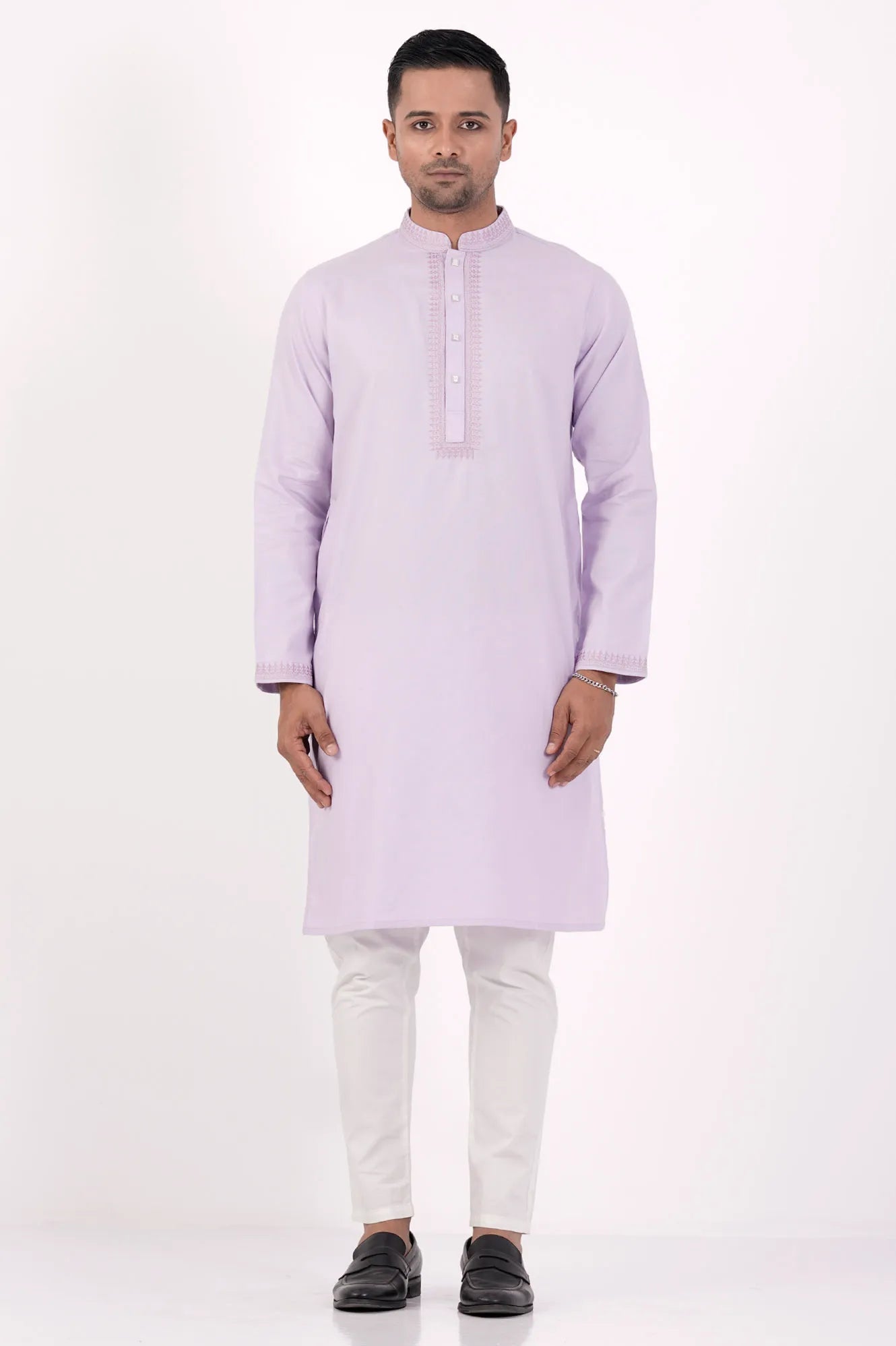 This cotton fabric panjabi with elegant embroidery on the collar and cuff, offering a stylish and comfortable choice for any occasion.