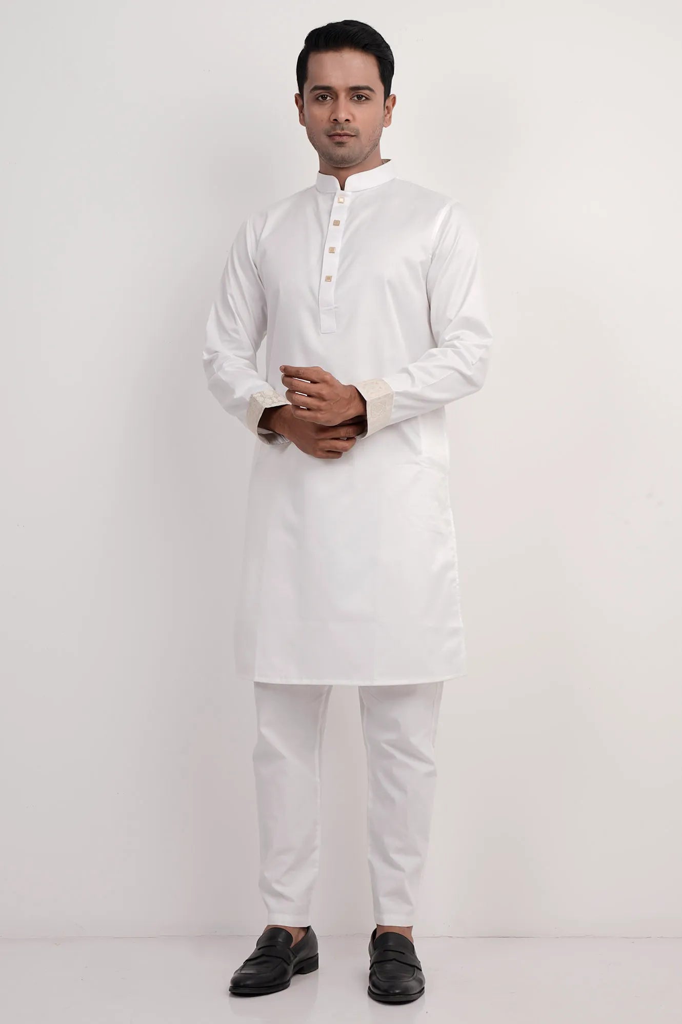 This white Panjabi, made from soft cotton fabric with contrast detailing, offers a stylish and sophisticated look, perfect for any occasion.