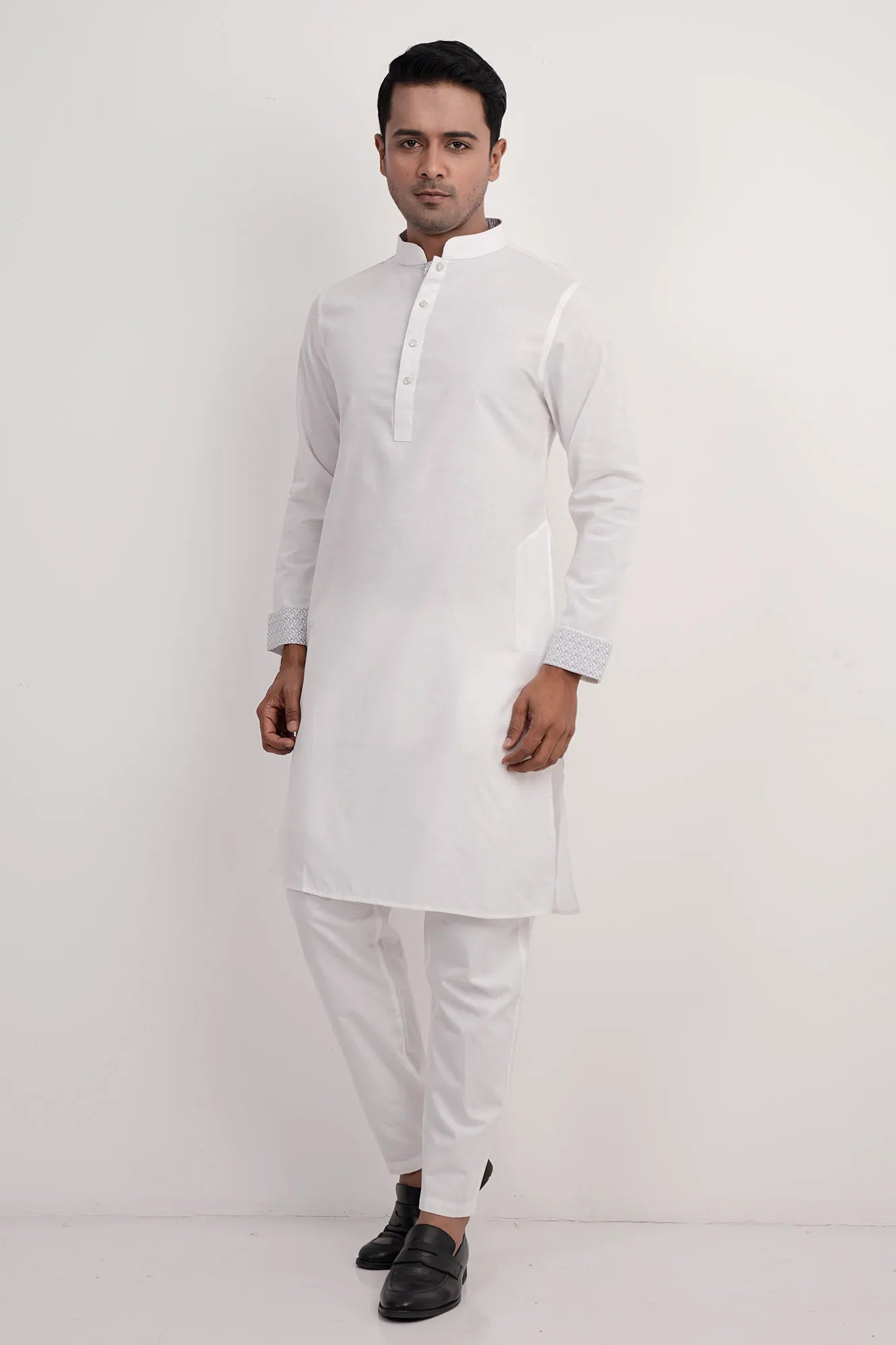 This white Panjabi is a timeless classic, made from soft cotton fabric with contrast detailing on the inside collar band, cuffs, and placket. It’s the perfect blend of elegance and modern style, keeping you classy and comfortable on any special occasion.