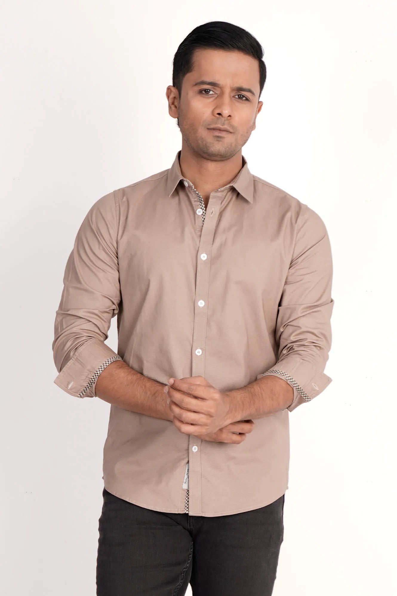 This taupe color casual shirt, made from soft cotton with contrast detailing, offers a modern and stylish look, perfect for both casual and semi-formal occasions.