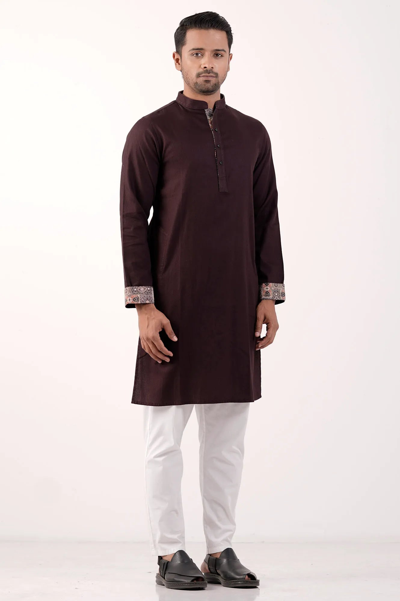 This Panjabi is the epitome of understated elegance, designed to provide maximum comfort without compromising on style. Featuring contrast fabric on the inside collar band, cuffs, and placket, it adds a subtle yet striking touch of detail that enhances its modern appeal.