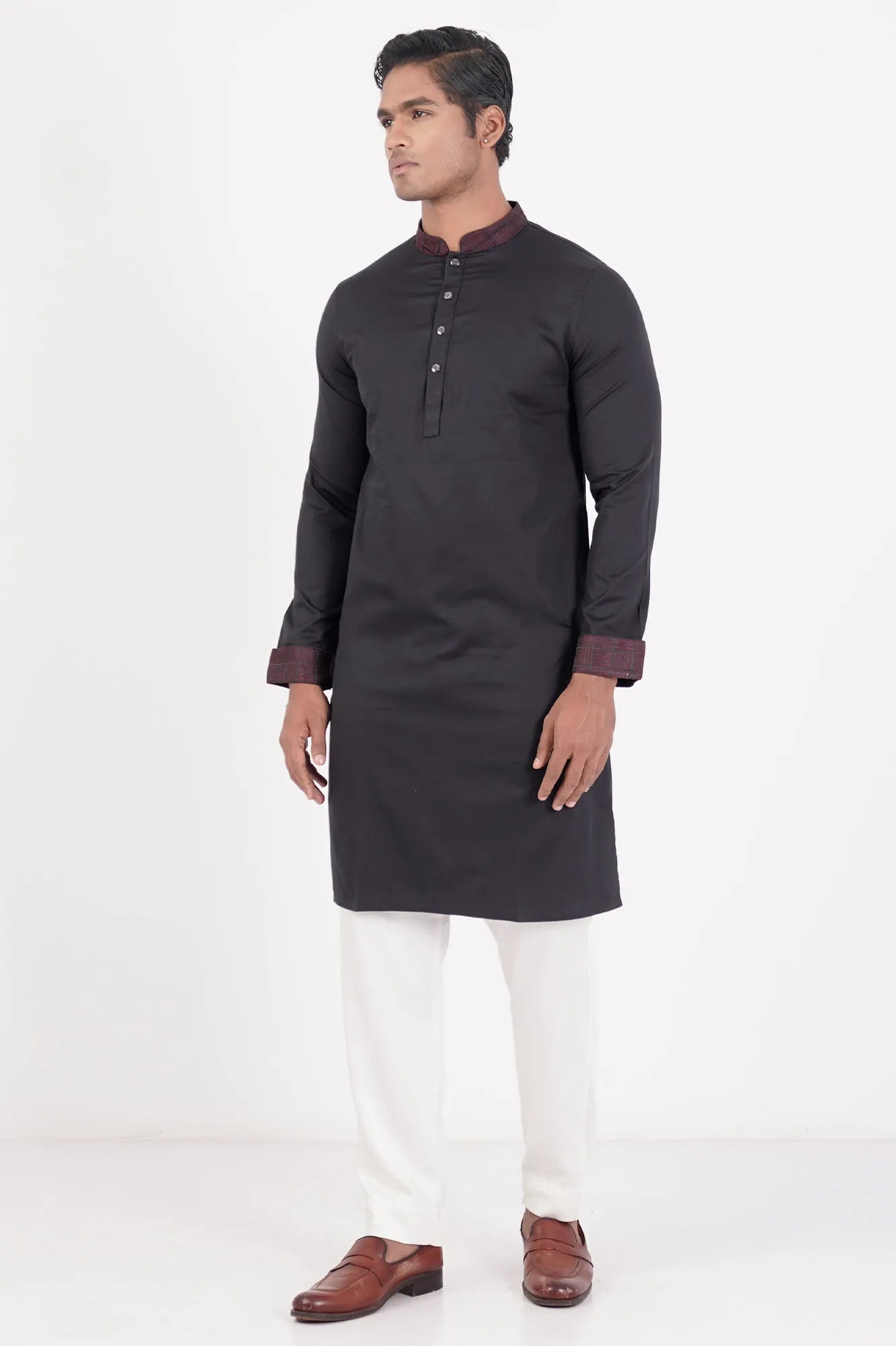 This premium panjabi for men features elegant contrast fabric on the collar, cuffs, and placket, blending traditional style with modern details for a sophisticated look. Perfect for special occasions, it offers both comfort and timeless appeal.