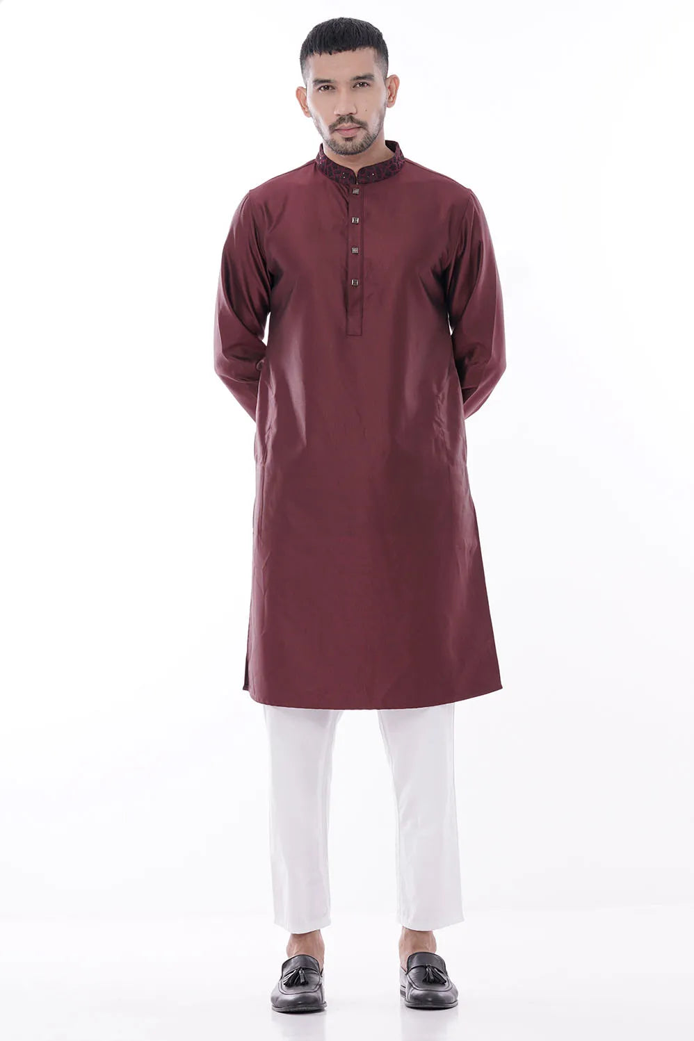 For a more stylish look, this Panjabi's contrast fabric is slightly different in shade or texture from the main fabric. This adds a subtle touch of elegance without being too overpowering.
