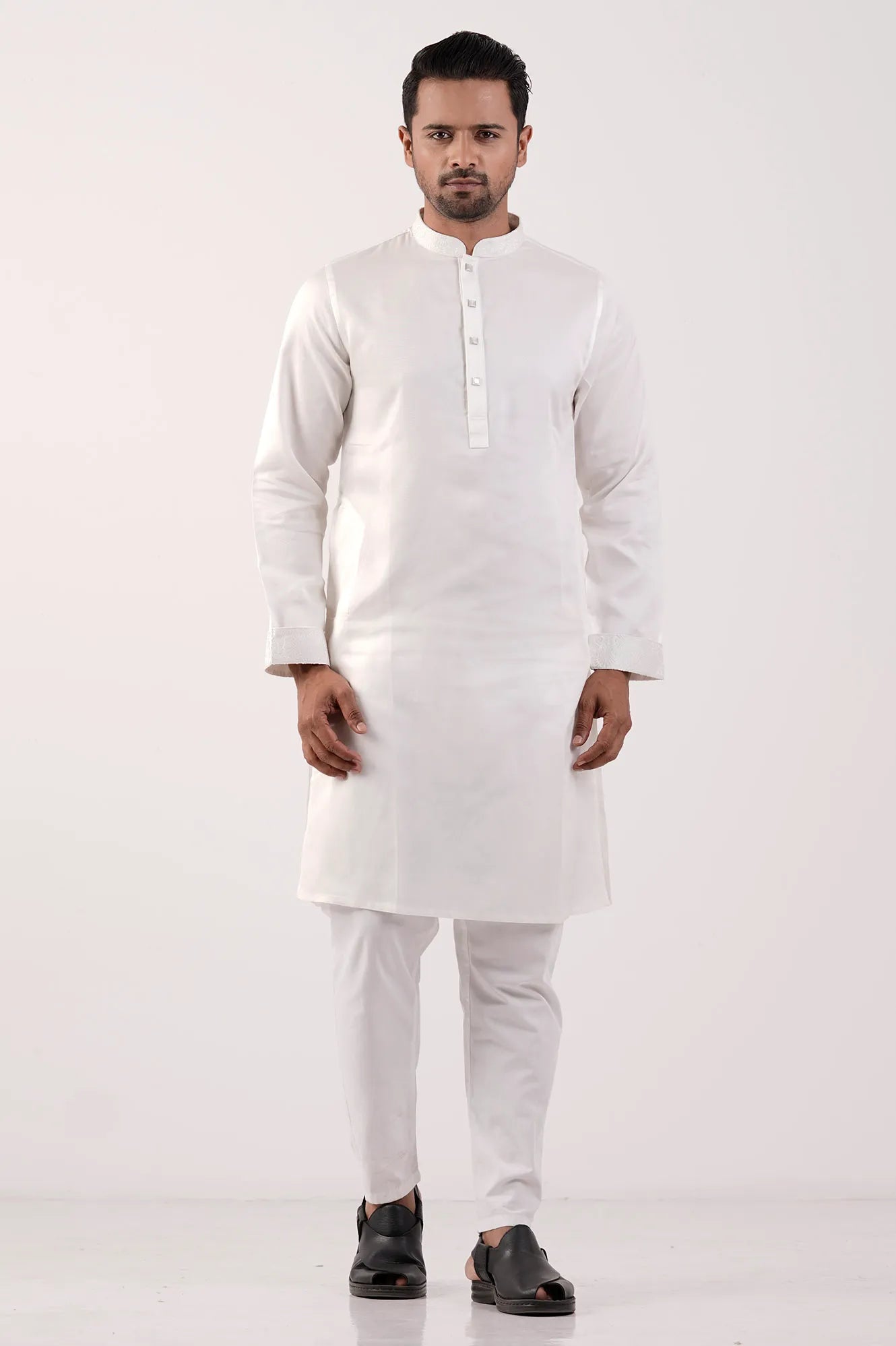 This Panjabi is the epitome of modern elegance, crafted from premium cotton fabric in classic white. The contrast detailing on the collar, cuff, and inside placket adds a stylish and trendy touch, making it perfect for any festive or formal occasion.