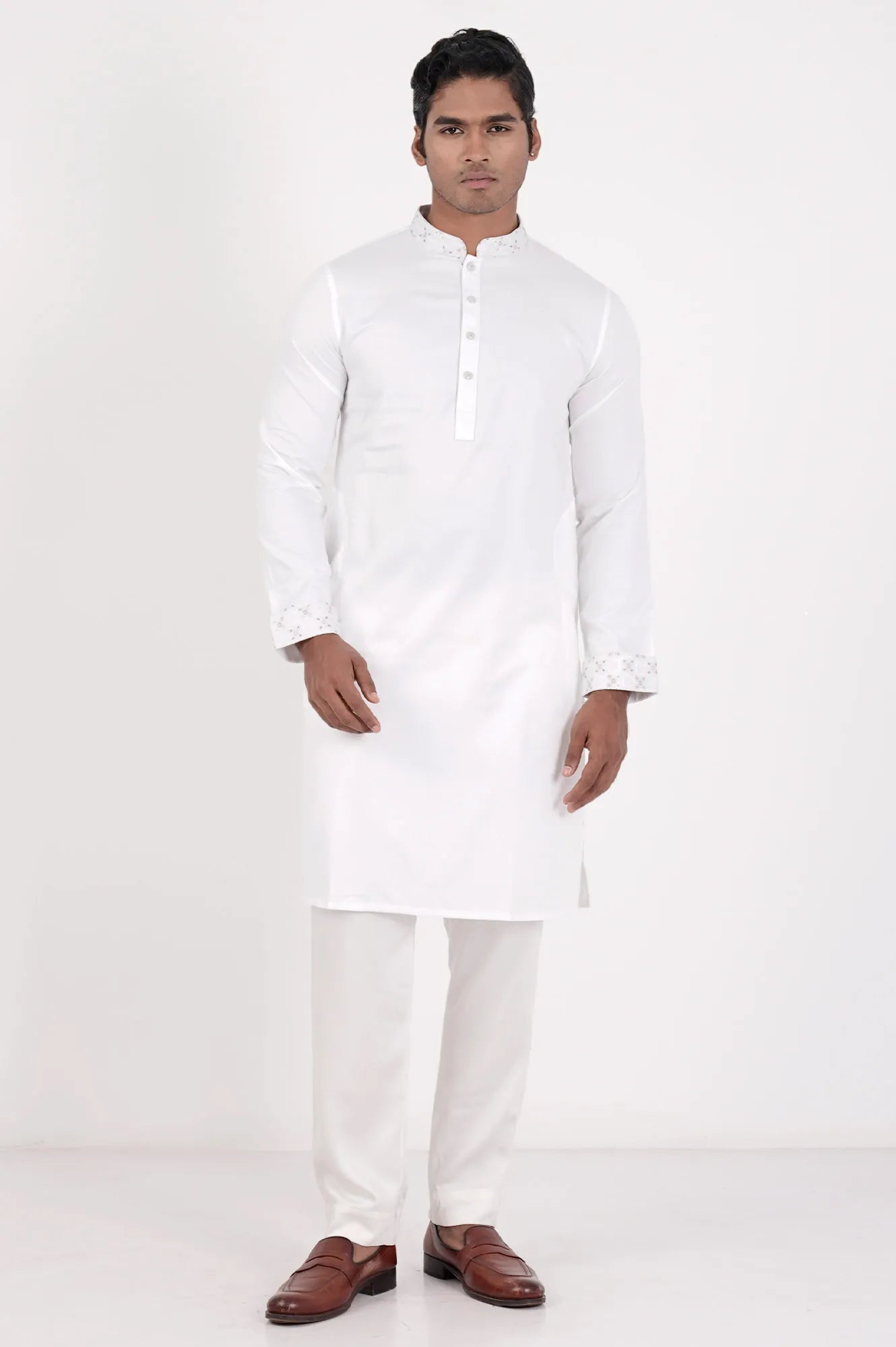 This premium panjabi for men features elegant contrast fabric on the collar, cuffs, and placket, blending traditional style with modern details for a sophisticated look. Perfect for special occasions, it offers both comfort and timeless appeal.